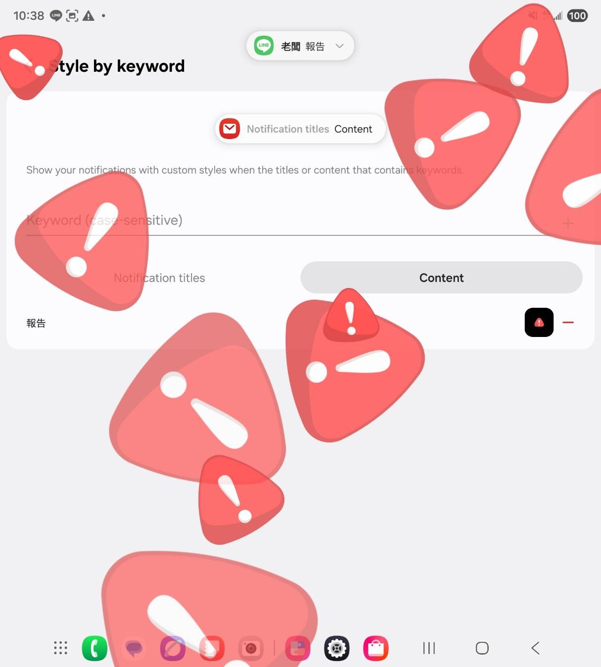要設定關鍵字風格也很簡單,只要進入「依關鍵字設定風格」選項,根據需求選擇要偵測「通知標題」還是「通知內容」,然後輸入想要自訂的文字即可。系統會自動辨識包含該關鍵字的通知,並套用你預設的視覺效果。這個功能特別適合需要快速區分工作與私人訊息的上班族,或是想要為特定聯絡人設定專屬通知效果的使用者。