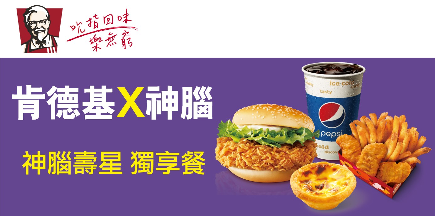 美味餐點包含一個咔啦雞腿堡+一份點心盒(上校雞塊+香酥脆薯)+一顆原味蛋撻+一杯百事可樂(小),原價184元,神腦壽星會員只要憑券就可享NT$129優惠價格!