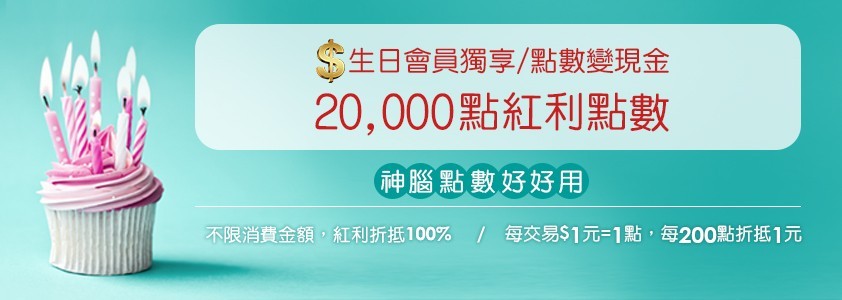 壽星當月獨享20000點生日紅利優惠,不需消費,只要登入即可領取,而且沒有折抵上限,於神腦的交易金額都可以100%抵用哦!