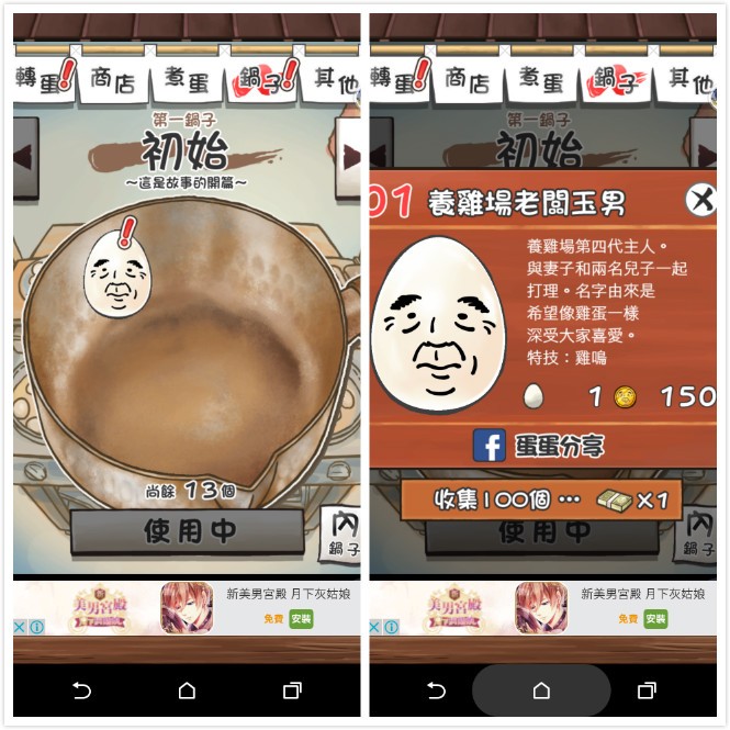 ▲ 煮好的阿伯(驚!?)會被放在鍋子裡等待,蒐集所有阿伯水煮蛋的話就會得到一疊鈔票,讓你在商店中購買特殊道具和新的蛋蛋。點選阿伯後還可以看到他們的人生故事(莫名心酸感…)
