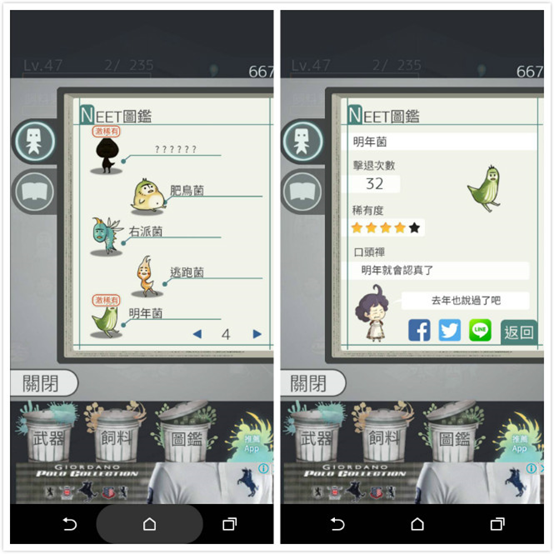 ▲ 還可以到圖鑑看打倒了多少幾隻懶人菌~小編玩到40多級,好不容易才抓到稀有懶人菌…