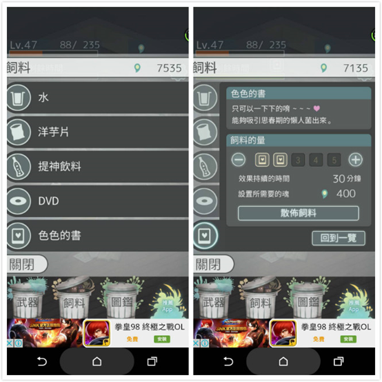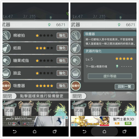 ▲ 這時候就趕緊裝備武器來打擊懶人菌吧!小編私心建議,一開始可以拼命強化紙扇(紙扇與板凳可是七大武器之首啊~),等到「魂」收集到25,000的時候,就可以購買吸塵器了(超強!!!)