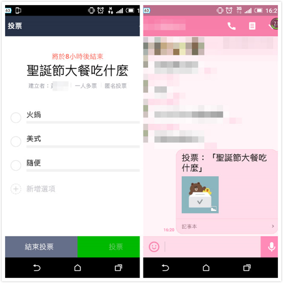 每次聚餐找餐廳,你的朋友裡也有個愛說「隨便」、「都可以」的人嗎?現在Line新增投票機制,讓大家想吃什麼自己選擇,不但節省了許多等待的時間,也能強迫那些「隨便」的朋友做出決定,使用之後覺得非常方便!