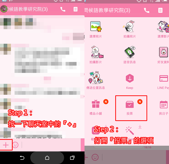 ▲ 首先,點選Line聊天室裡右下角的加號,再來會看到功能列新增了一個『投票』選項。