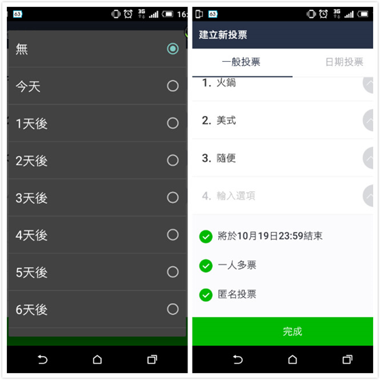 ▲ 輸入完要投票的項目,還可以設定投票活動將在幾天之後結束(左圖);也可以選擇是否要『一人多票』或是『匿名投票』(右圖)。