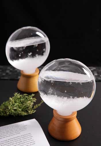 看似平凡無奇的玻璃球中裝著白色的顆粒,其實這是在密封的玻璃球內裝入事當比例的酒精、蒸餾水、硝酸鉀、樟腦等原料,如此一來玻璃球就會因天氣狀況產生不同的結晶變化,不只是唯美的桌面擺飾,也是個浪漫的方法提醒你今天的天氣狀況喔!