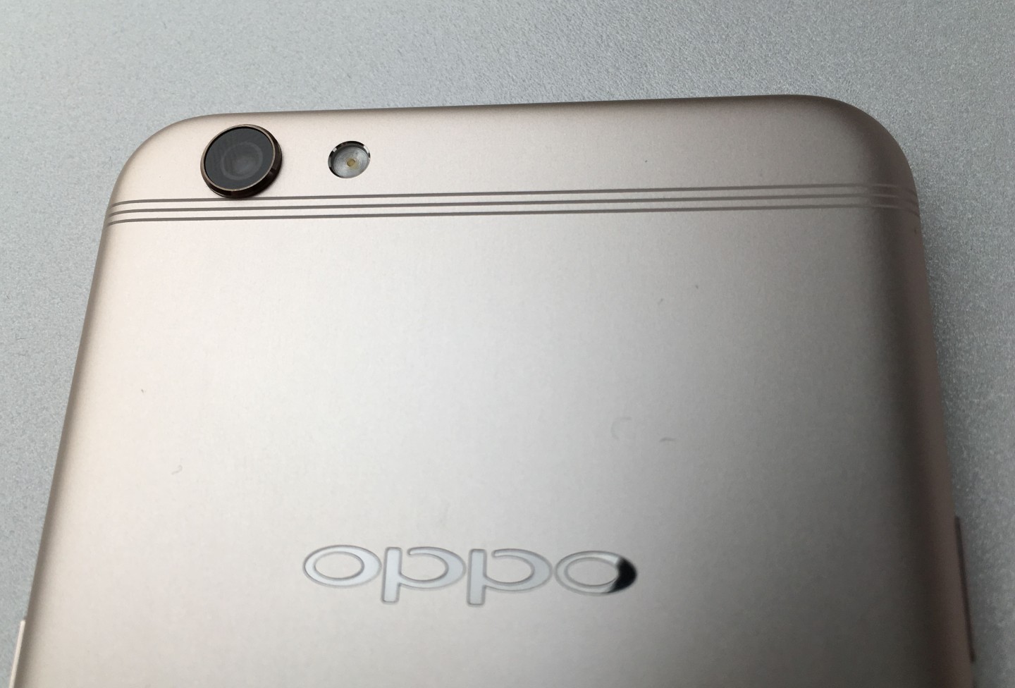 OPPO R9s一大創新亮點為,機身背面上下各3條寬度僅0.3mm的微縫天線,與手機背蓋金屬融為一體;另外主鏡頭畫素為1,600萬,一旁還配有補光燈設計。