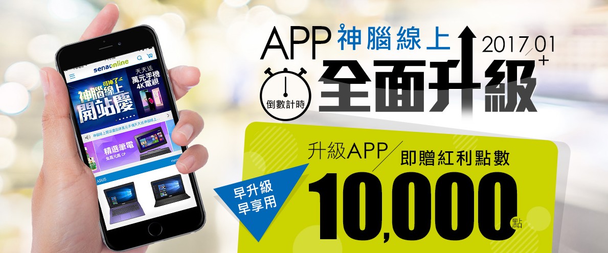 神腦將於2017年1月起正式推出購物APP「神腦線上」,讓您隨時隨地享受網路與門市24小時不斷線的數位生活,與生活商品等等購物服務,精彩您的享樂生活!