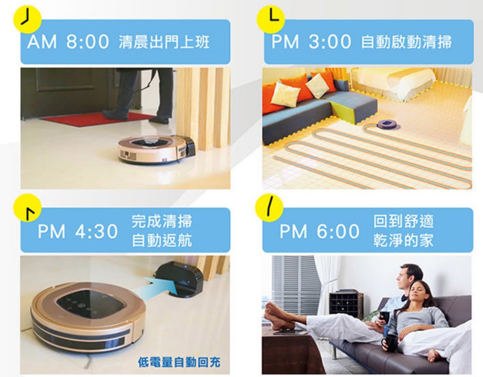 除了結集掃、吸、拖、擦四功能於一身,THOMSON智慧型掃地機器人還有許多聰明人性的設計,例如支援預約清掃功能,使用者可設定每天定時巡航清掃,例如當你早上8點出門上班,就可以事先設定下午3點自動啟動清掃,大約耗一小時半,打掃完THOMSON智慧型掃地機器人便會自動返航進行充電,當晚上回到家就可以享受舒適乾淨的居家空間。