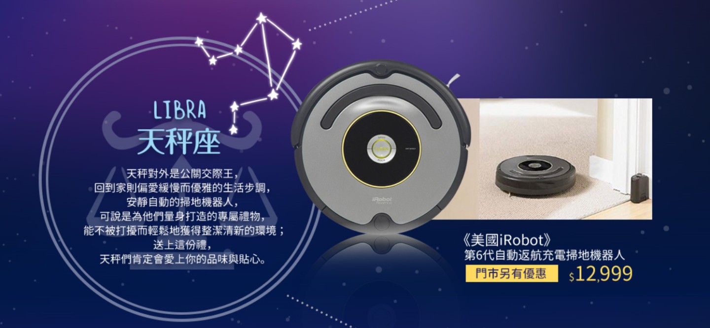 天秤對外是公關交際王,回到家則偏愛緩慢而優雅的生活步調,安靜自動的掃地機器人,可說是為他們量身打造的專屬禮物,能不被打擾而輕鬆地獲得整潔清新的環境;送上這份禮,天秤們肯定會愛上你的品味與貼心。