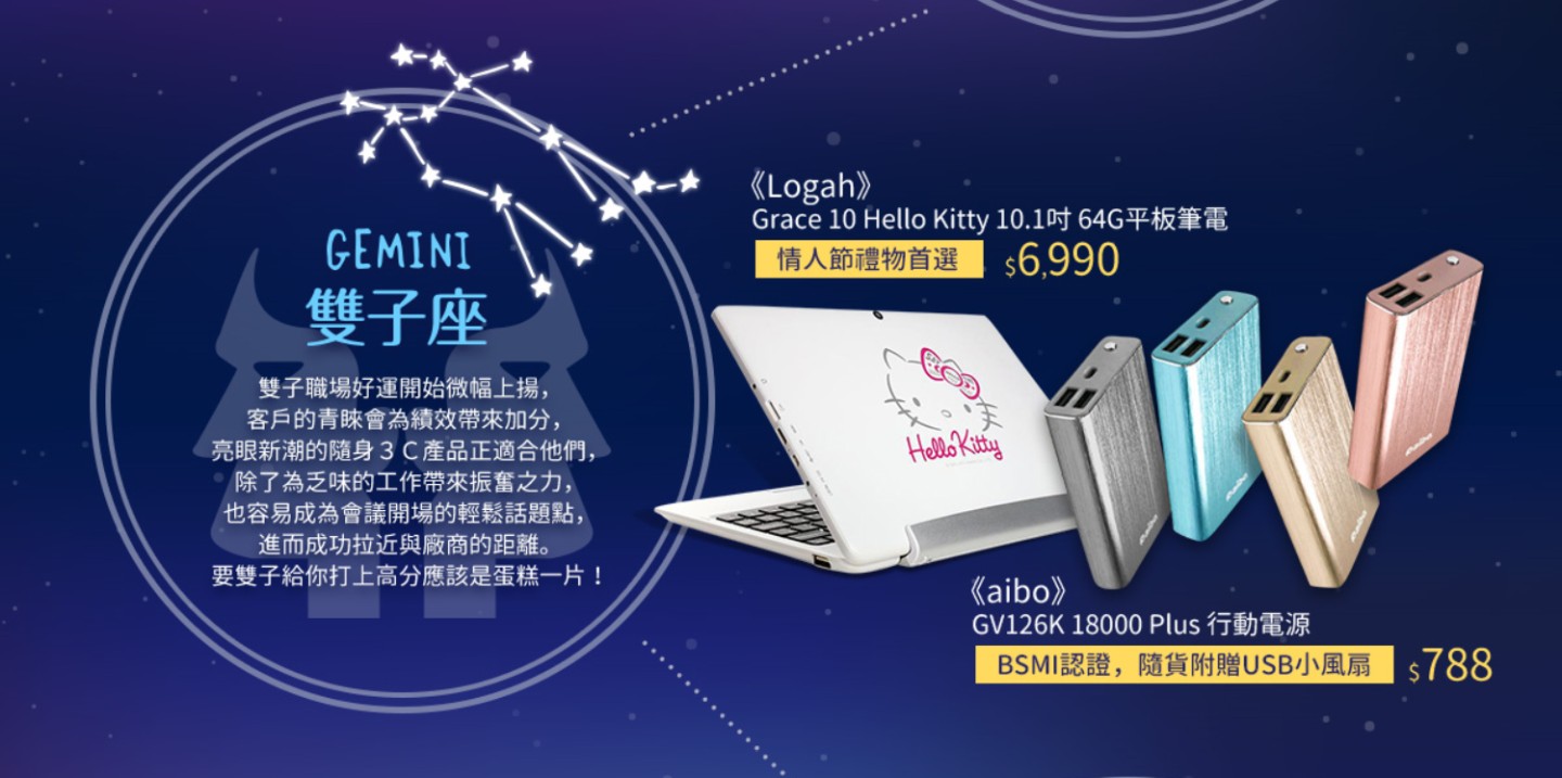 雙子座:HelloKitty平板電腦、aibo行動電源