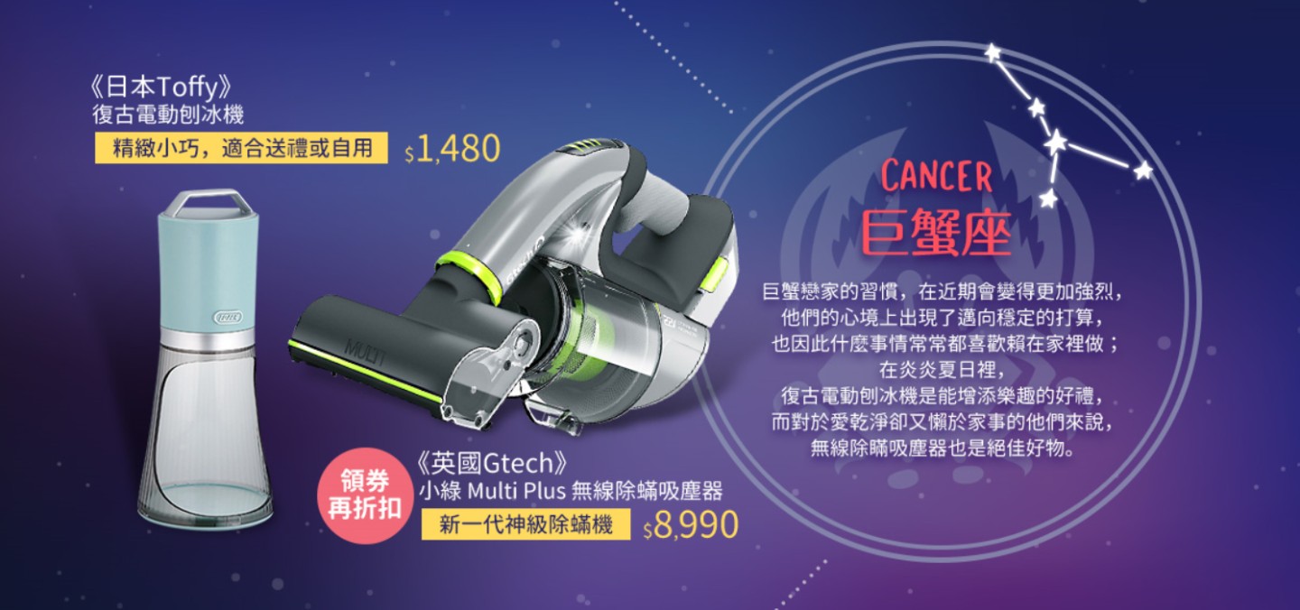 巨蟹戀家的習慣,在近期會變得更加強烈,他們的心境上出現了邁向穩定的打算,也因此什麼事情常常都喜歡賴在家裡做;在炎炎夏日裡,復古電動刨冰機是能增添樂趣的好禮,而對於愛乾淨卻又懶於家事的他們來說,無線除瞞吸塵器也是絕佳好物。