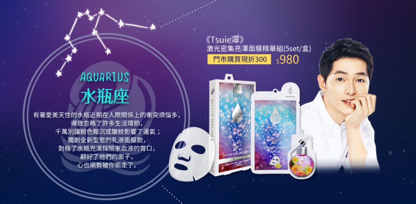 有著愛美天性的水瓶近期在人際關係上的衝突煩惱多,導致忽略了許多生活環節,千萬別讓臉色黯沉或皺紋影響了運氣;獨創全新型態的乳液面膜款,對極了水瓶充滿探險家血液的胃口,顧好了他們的面子,心也順勢被你偷走了。