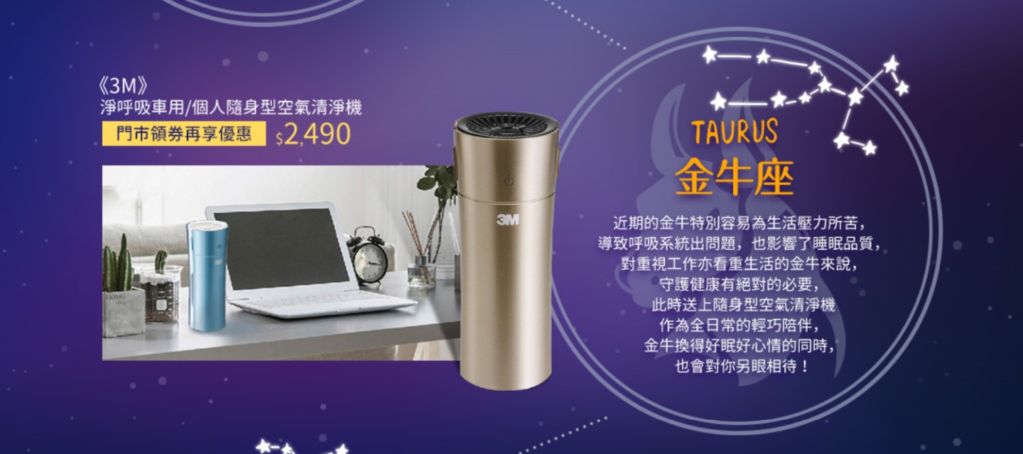 近期的金牛特別容易為生活壓力所苦,導致呼吸系統出問題,也影響了睡眠品質,對重視工作亦看重生活的金牛來說,守護健康有絕對的必要,此時送上隨身型空氣清淨機作為全日常的輕巧陪伴,金牛換得好眠好心情的同時,也會對你另眼相待!