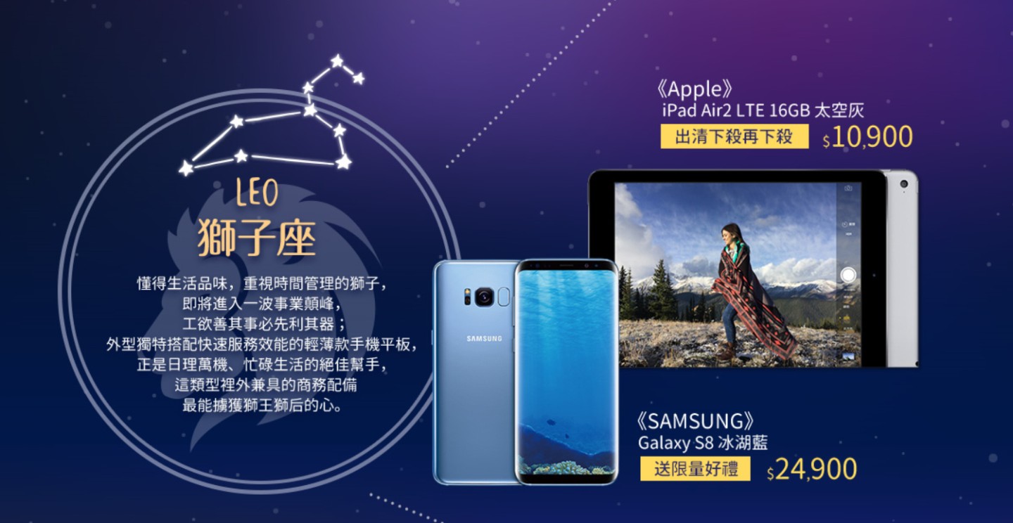 獅子座:iPadAir2 、Galaxy S8 冰湖藍