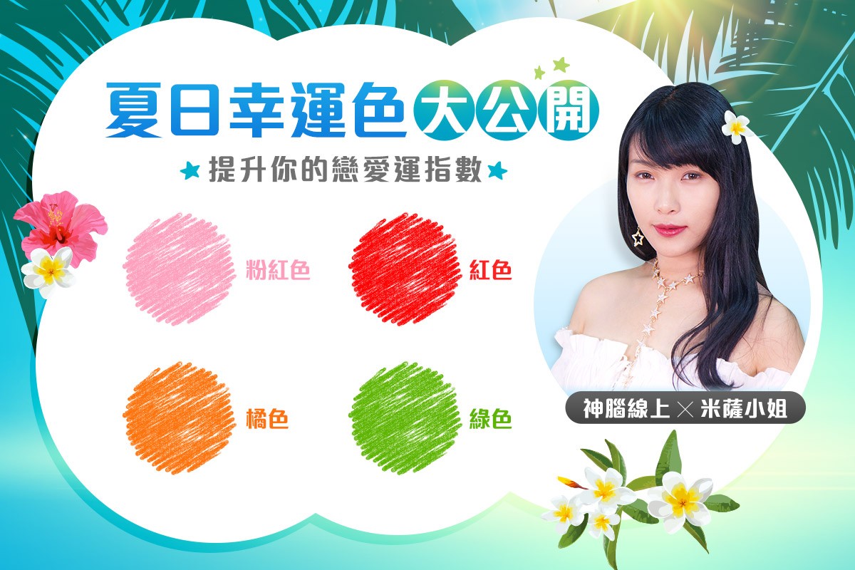「橘色」是今年夏天最能為你帶來幸運的顏色,它象徵著你親切、體貼的人格特質,能迅速打開你的人際關係,幫助吸引與你品味相符的另一半,亦能讓情緒長期維持在平和、喜悅的情境當中。也可以在日常飲食中加入橘色系飲品作為營養補充,橘色能量能強化消化系統,舒緩橘色人因慣性擔憂而起的腸胃問題。