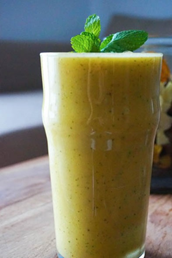 - 薄荷葉放入果汁機打碎,再加入奇異果、蘋果一起打成汁,攪拌均勻後就完成了!