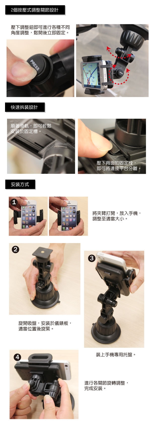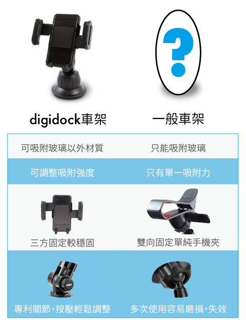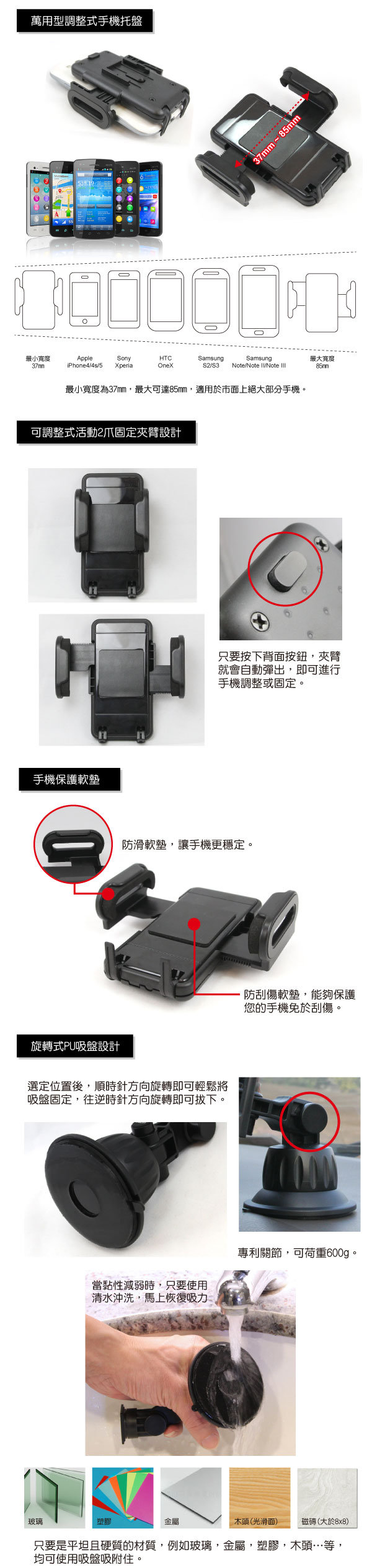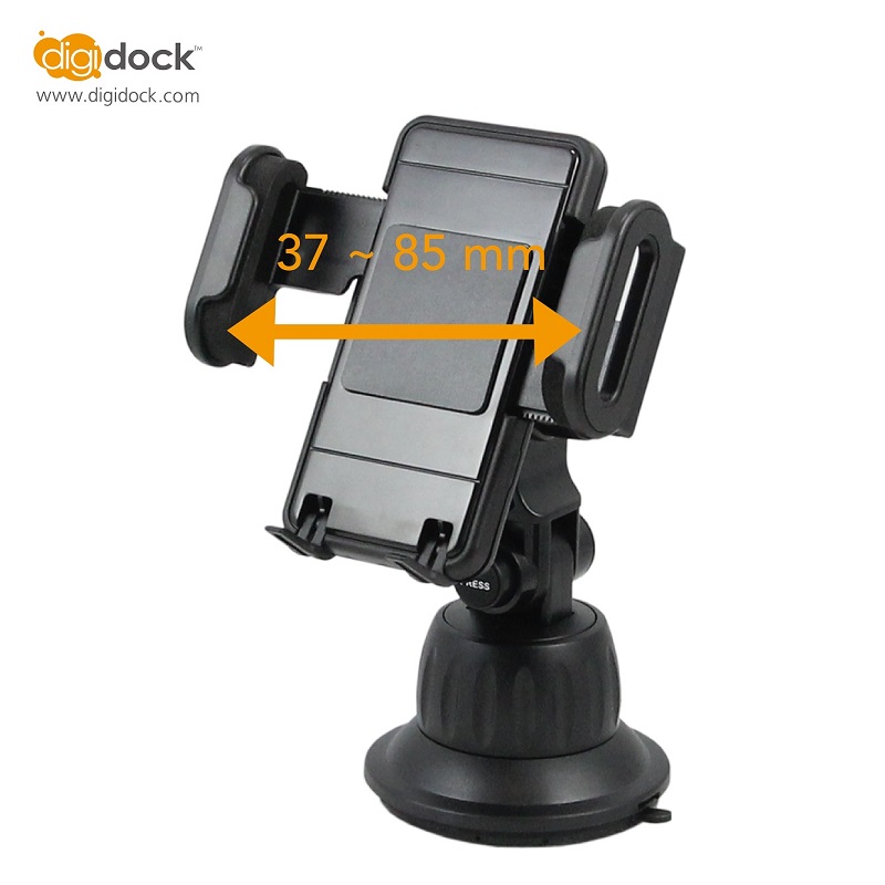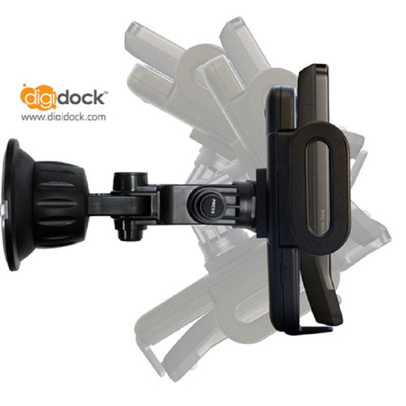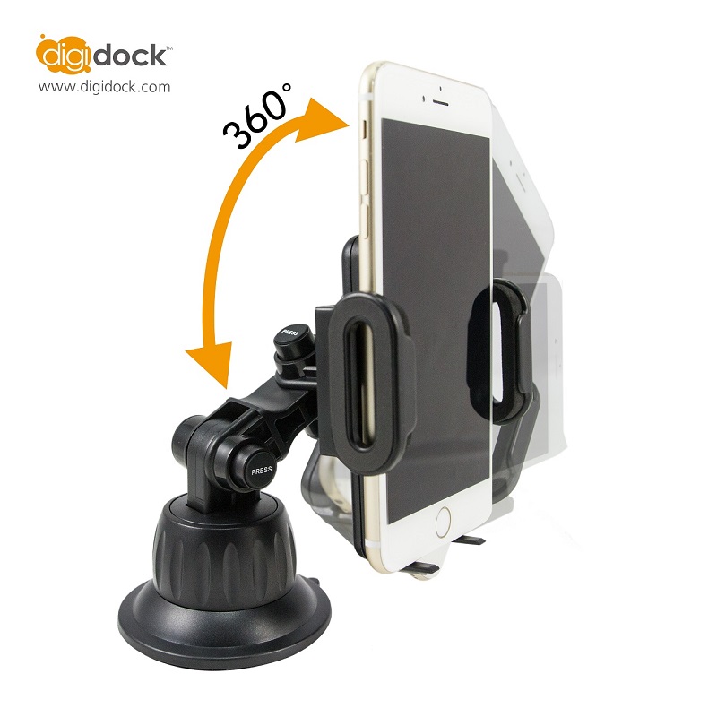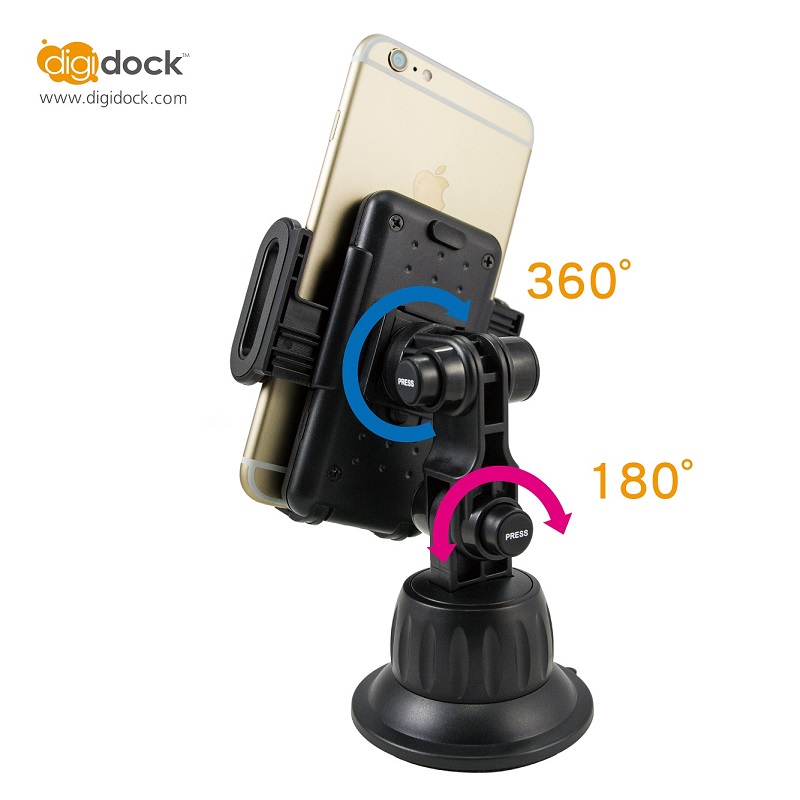 digidock特別為您推出通用型車用手機架,不僅適用市面上眾多機型的手機及行動播放裝置,專利的吸盤設計及按壓式旋轉關節更提供給您穩固的支撐力,簡易的安裝不需破壞車體,讓你在車子行進間充分使用產品功能,特珠材質PU黏性吸盤,可穩固的黏貼在咬花的汽車儀表板平面上!