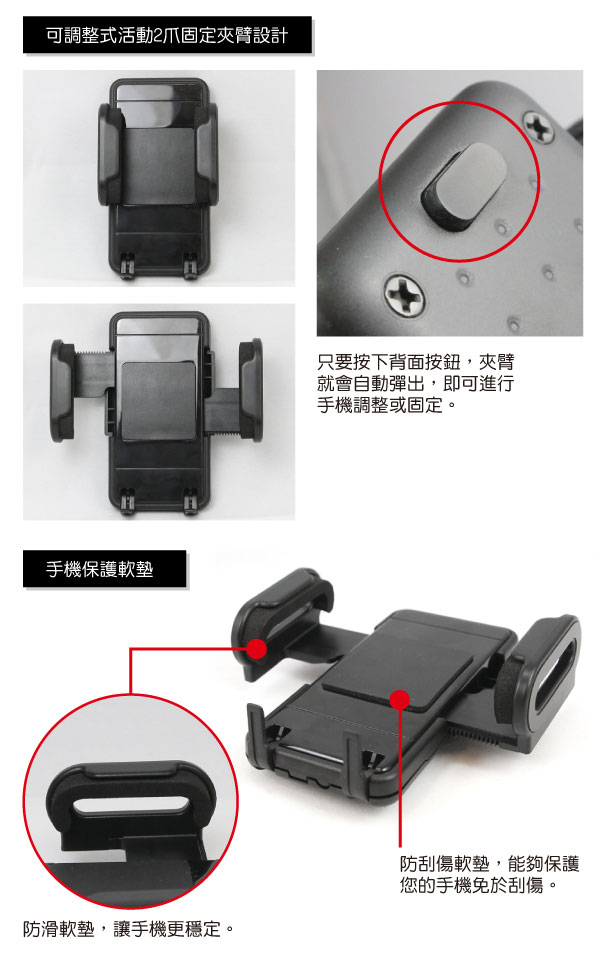 雙臂上附有海綿之壓和設計,不傷手機表面卻可緊緊咬合,轉彎行進中不用擔心掉落