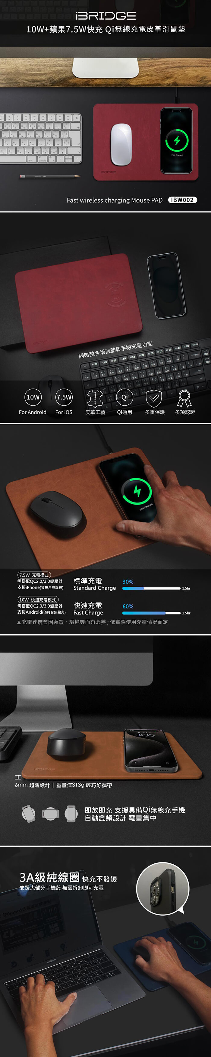 iBRIDGE 10W+蘋果7.5W快充Qi無線充電皮革滑鼠墊-深海藍