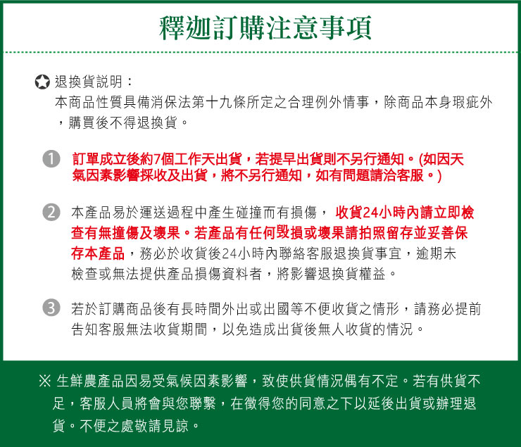 2.出貨日:預計7個工作天依訂單順序陸續出貨。由於農產品容易因天氣/節氣等因素影響採收,如有特殊情況發生將做公告說明。若您於訂購商品之後有外出或出國等計畫,請務必提前告知客服不可收貨日期,或來電通知,以免造成出貨後無人收貨的情況。