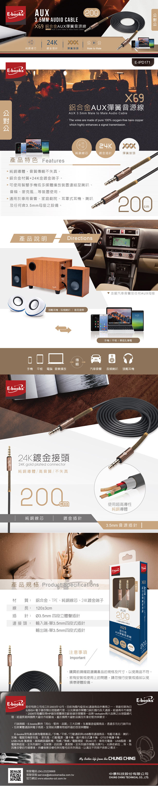 E-books X69 鋁合金AUX彈簧音源線公對公3.5mm-200cm