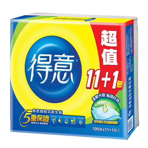 【得意】連續抽取式花紋衛生紙100抽*(11+1)包*7袋(84包)