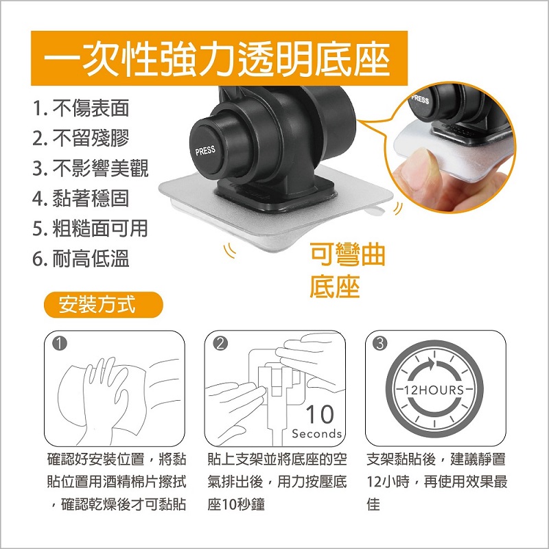 ●單次使用特殊黏膠,能穩固黏著在儀表板位置.