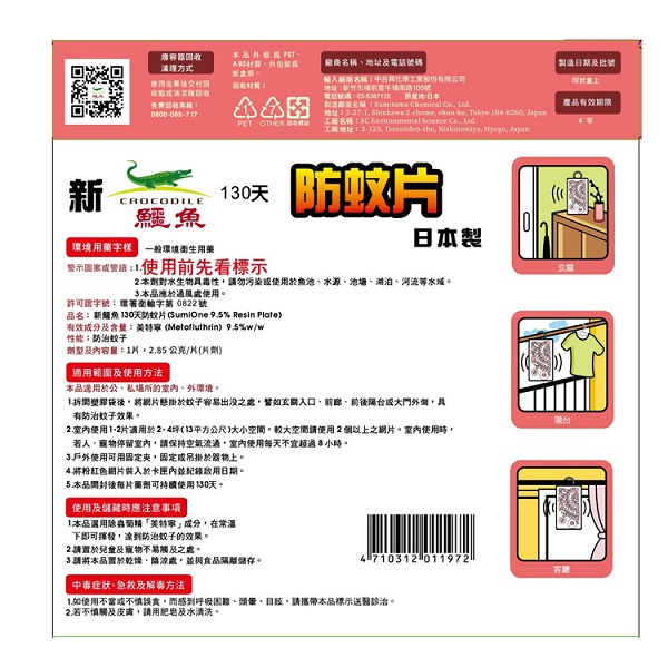 新鱷魚130天防蚊片-許可證字號環署衛輸字第0822號