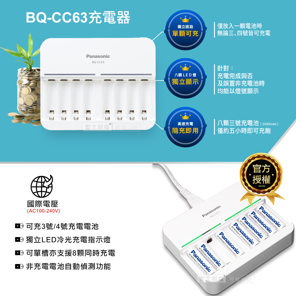 Panasonic 國際牌 BQ-CC63 智控 8 槽電池充電器+ eneloop pro 鎳氫充電電池 (4號4入)