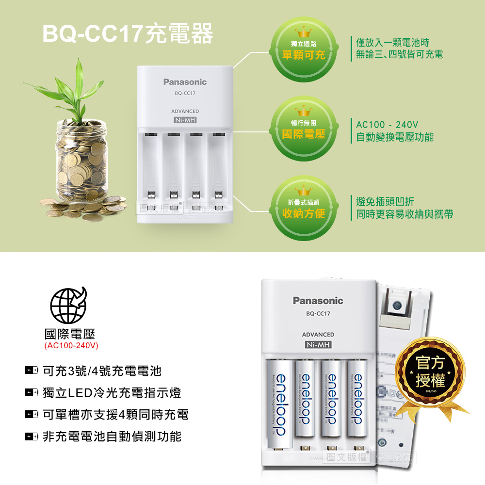 【Panasonic 國際牌】BQ-CC17 智控 4 槽電池充電器 + eneloop 鎳氫充電電池-標準款(3號4入)