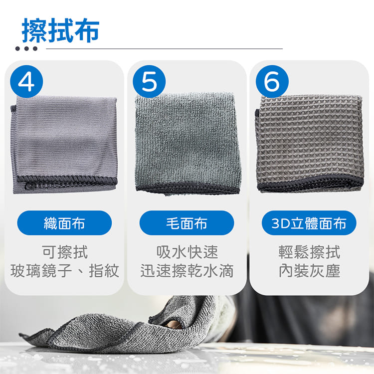 ★三款擦拭布:織面布x1 毛面布x1 3D立體面布x1