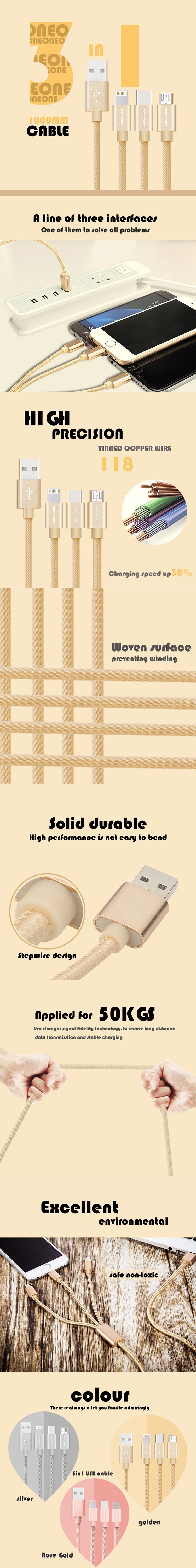 JELLICO 1.2M 優雅系列 3合1 Mirco-USB/Lightning/Type-C 充電線-金色 JEC-GS13-GD