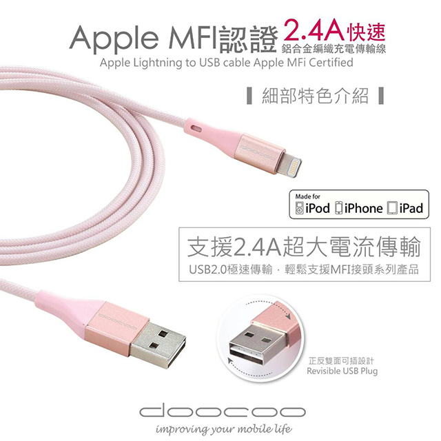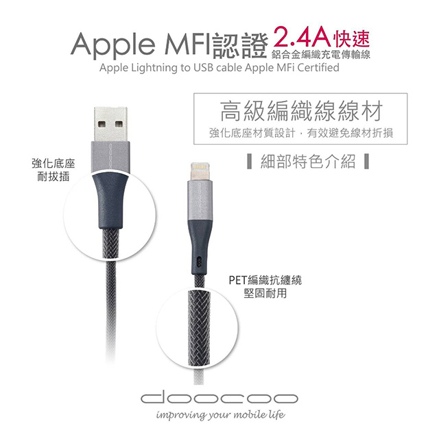 【doocoo】Apple Lightning MFi 鋁合金編織充電傳輸線-120CM