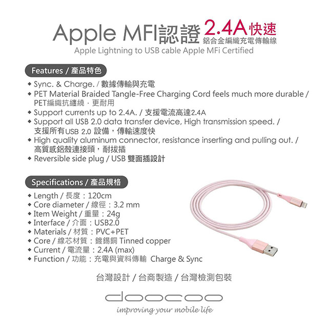 【doocoo】Apple Lightning MFi 鋁合金編織充電傳輸線-120CM