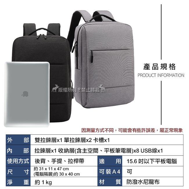 15.6吋 透氣多層 USB充電 休閒/時尚 防潑水平板筆電商務旅行後背包
