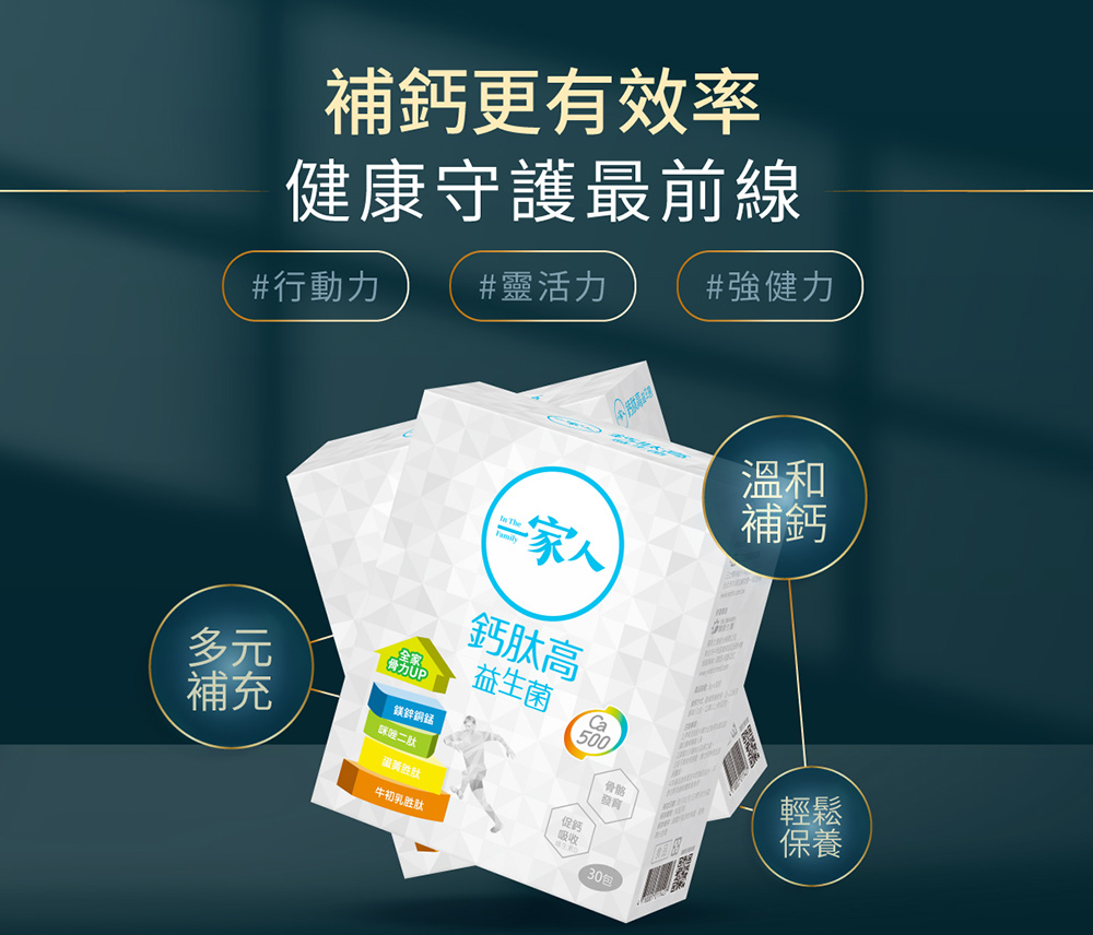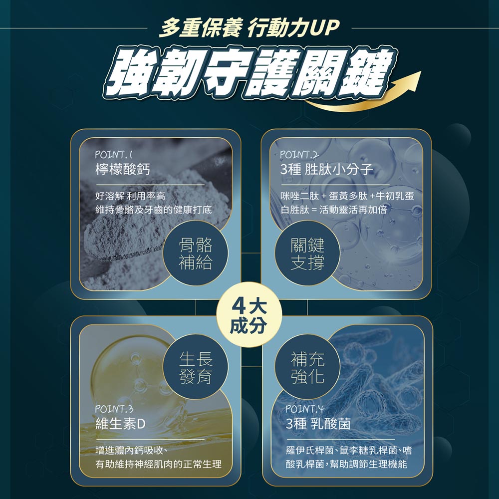 ●促鈣吸收500mg ! ●三種有益菌株! ●三種特殊胜肽! ●四種精選微量元素!