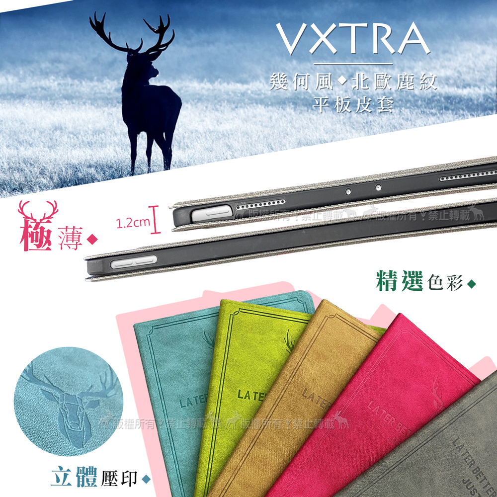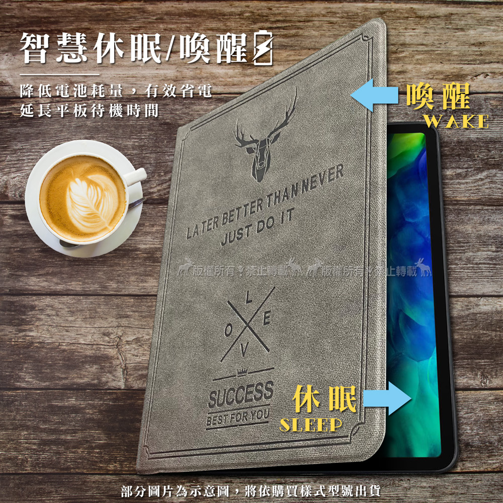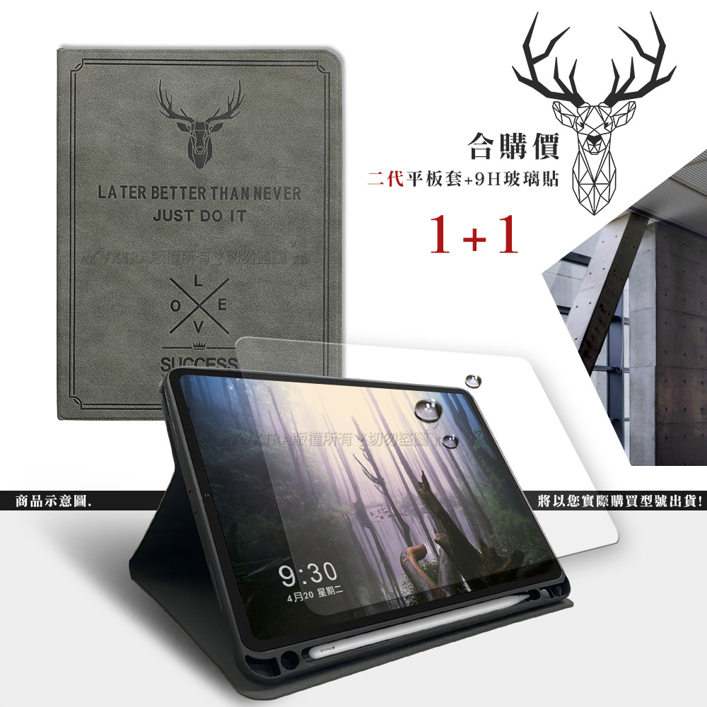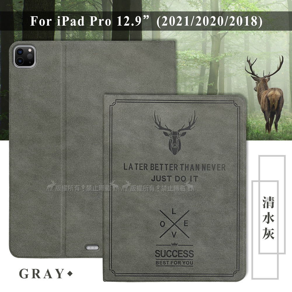 二代筆槽版 iPad Pro 12.9吋 2021/2020/2018版通用 北歐鹿紋平板皮套(清水灰)+9H玻璃貼(合購價)