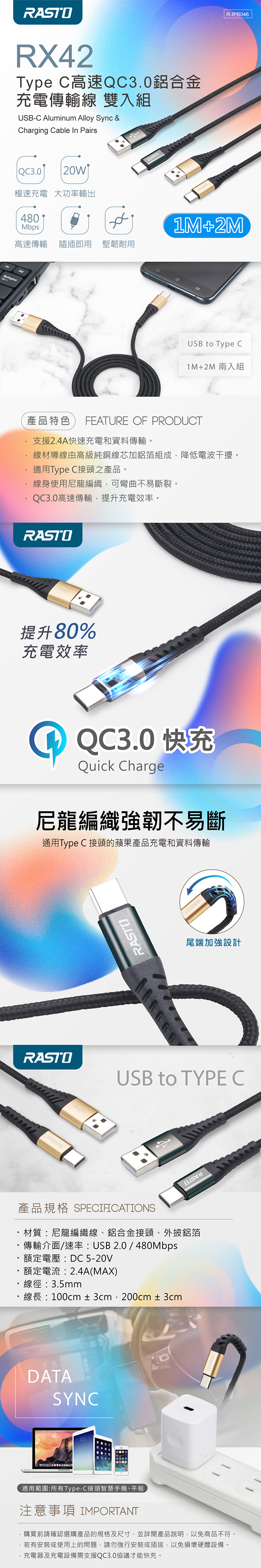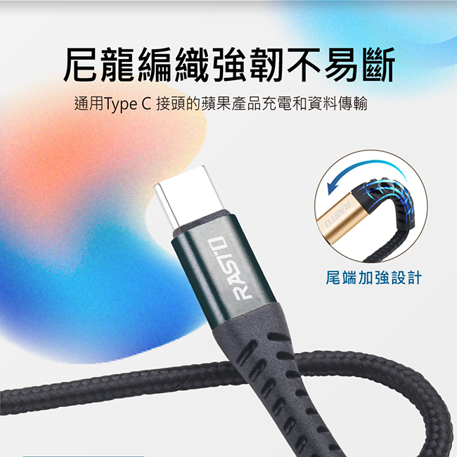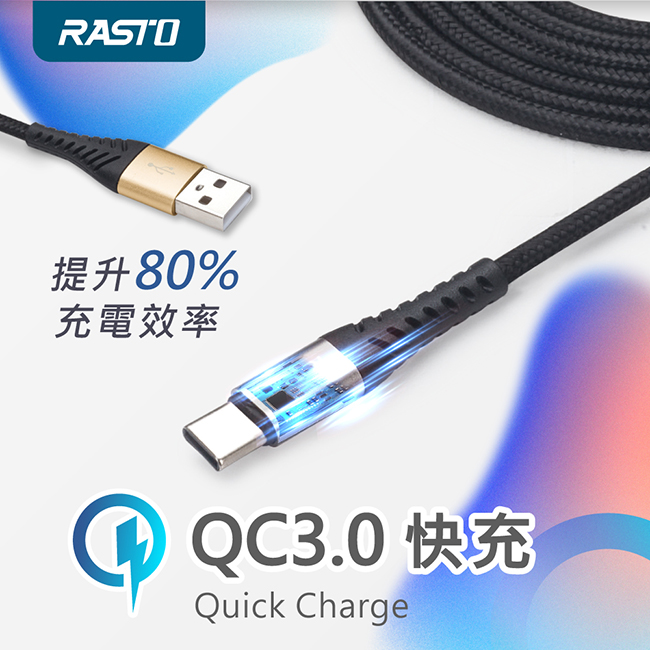 RASTO RX42 Type C 高速QC3.0鋁合金充電傳輸線雙入組1M+2M