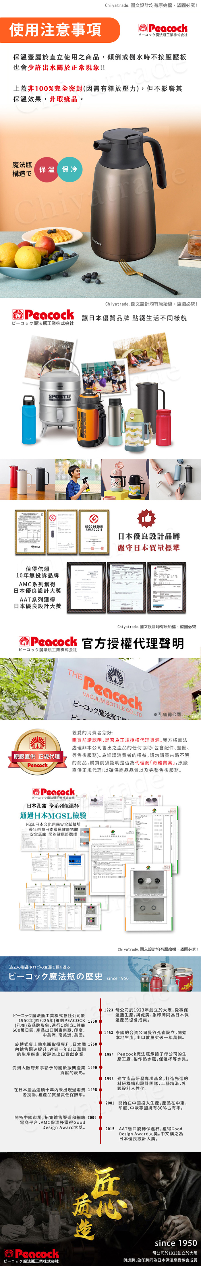 日本孔雀Peacock母公司於1923年創立於大阪,從事保溫瓶生產。與虎牌、象印牌同為日本保溫產品協會成員。