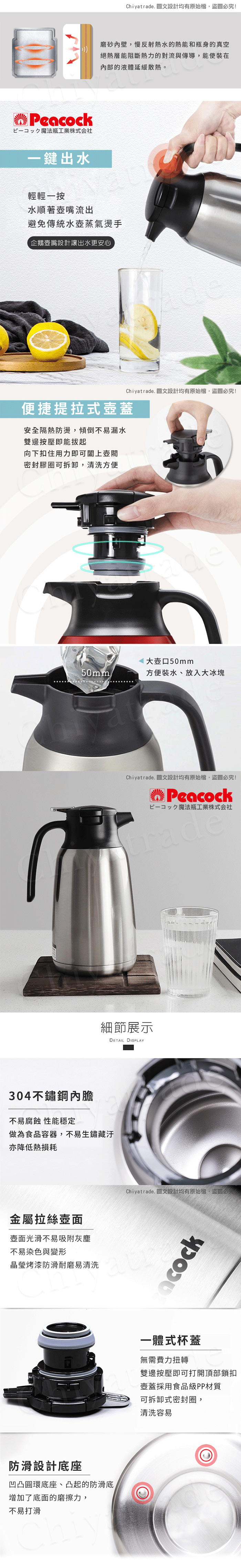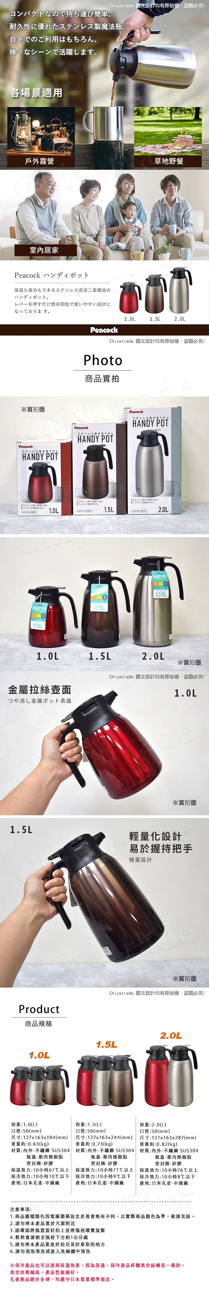 【日本孔雀Peacock】真空斷熱不鏽鋼保溫壺保溫瓶 1.0L-原鋼色(一鍵按壓出水)