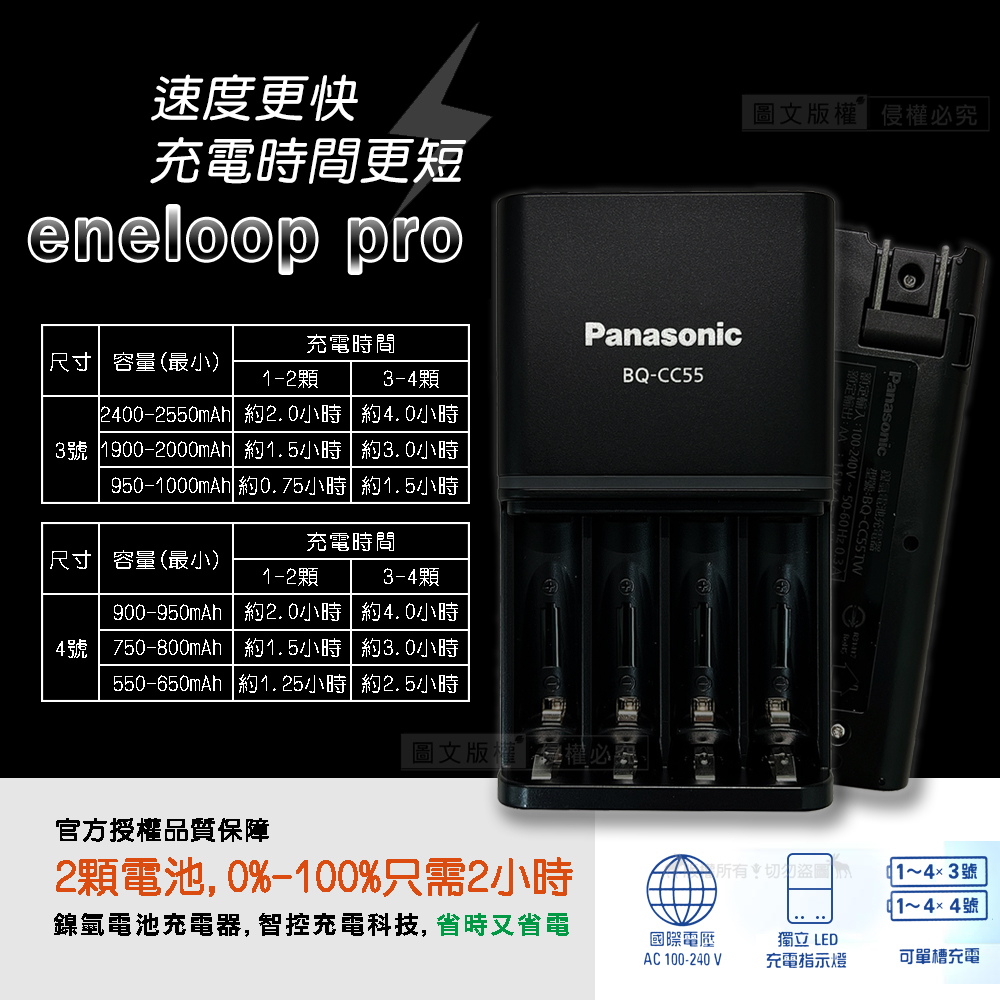 全球變壓AC 100-240V 可單槽充電,獨立充電指示燈 2顆電池充電時間只需2小時 低記憶性不須放電
