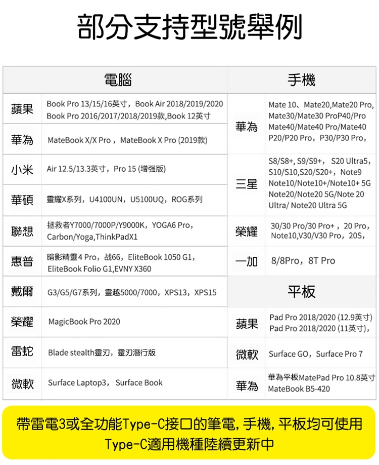 適用設備:適用Apple MacBook Pro 2016/2017/2018/2019/2020/2021等主流Type-C筆記型電腦,手機,平板等