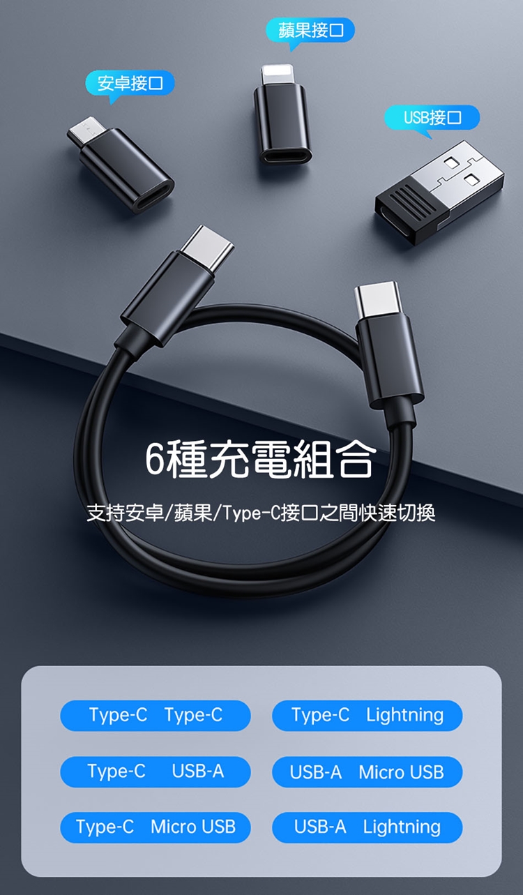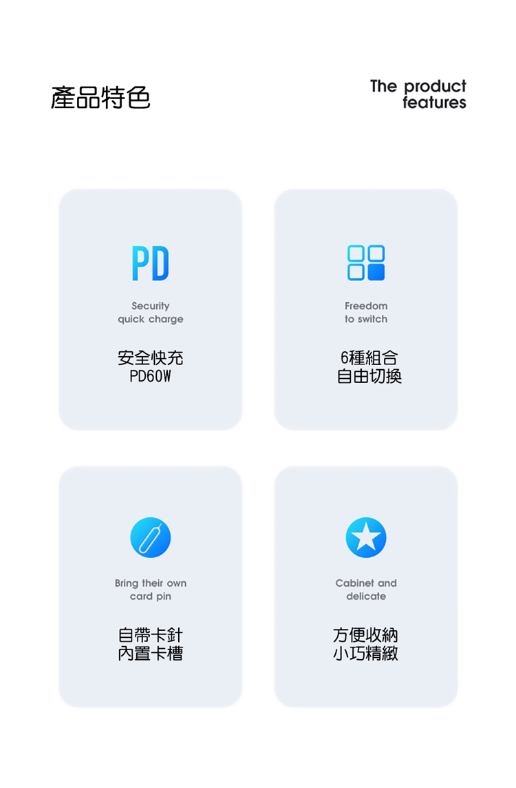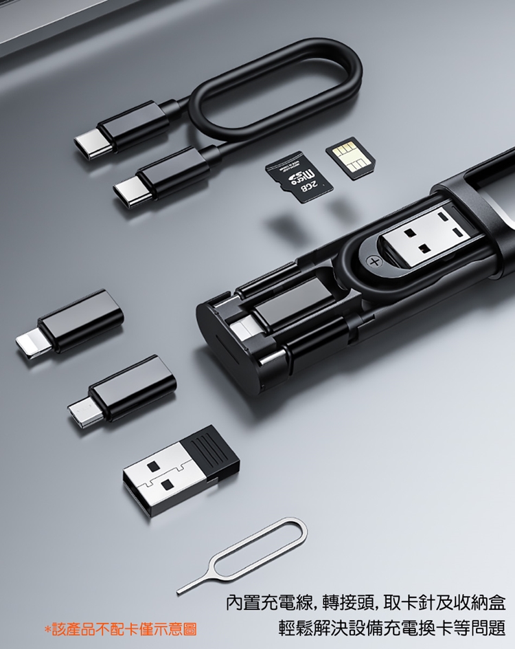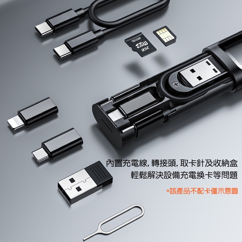 內容物:數碼多功能收納盒,C to C數據線,Type-C轉Mirco USB接頭,Type-C轉Lightning接頭,Type-C轉USB-A接頭,Sim卡取卡針