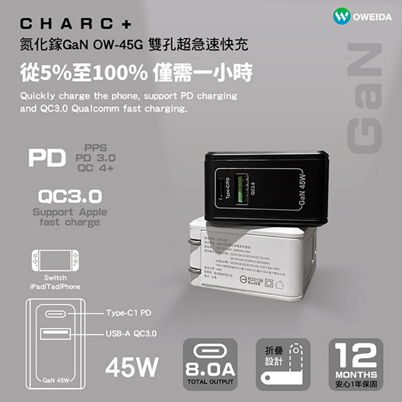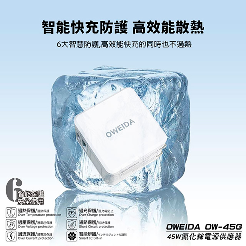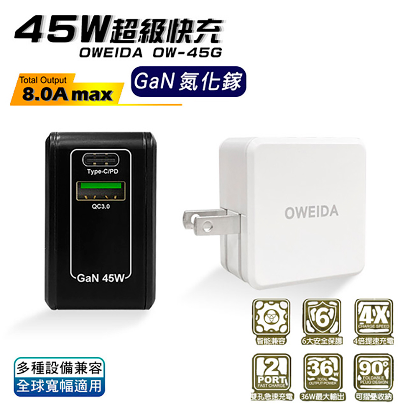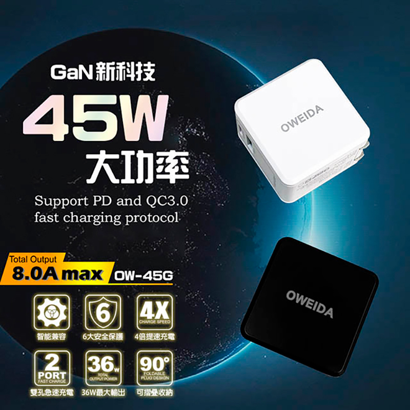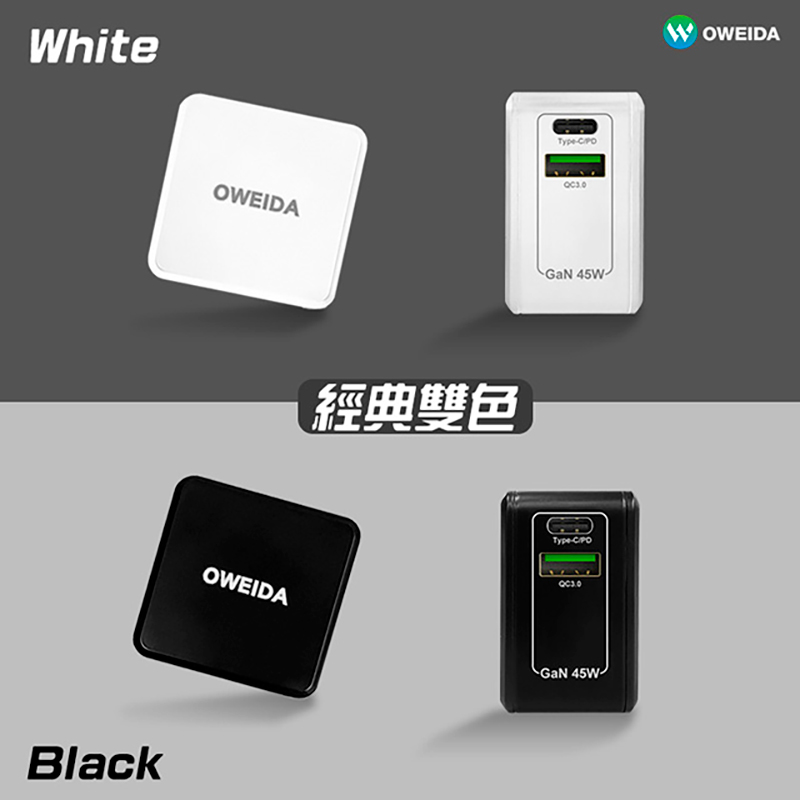 Oweida GaN PC+QC3.0 氮化鎵電源供應器(45W)(白色)