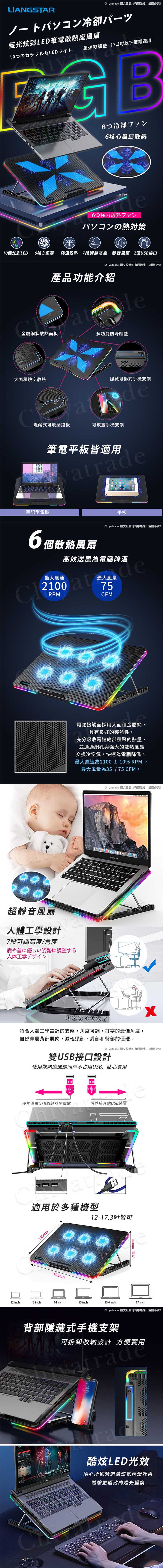 【LiANGSTAR】冷光炫彩LED 筆電散熱風扇 六核風扇 10段炫彩 7段高度 可調風速(可電競掛機)
