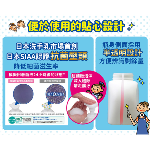 ・獨特壓頭可壓出超扎實濃密泡泡,且為通過日本SIAA認證的抗菌壓頭,可降低細菌
