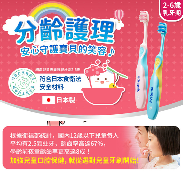 專為2至6歲正值乳牙期的小寶貝所設計的訓練牙刷,可全面清潔乳牙與較寬齒縫間的每個角落,保護好小寶貝的牙齒、牙齦,並幫助牙齒健康發育。