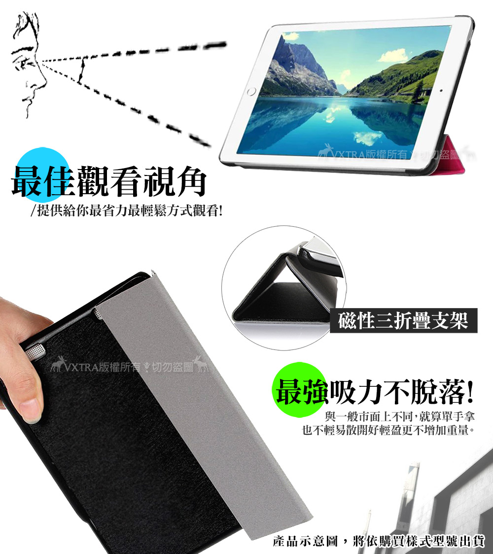 .皮革紋最耐看,隱形磁扣最貼心 .最穩固三折式折疊支架,完美體驗 .內側完美包覆,免除任何刮傷 .易拆卸、耐髒,耐用度加倍 .門市不提供代貼服務
