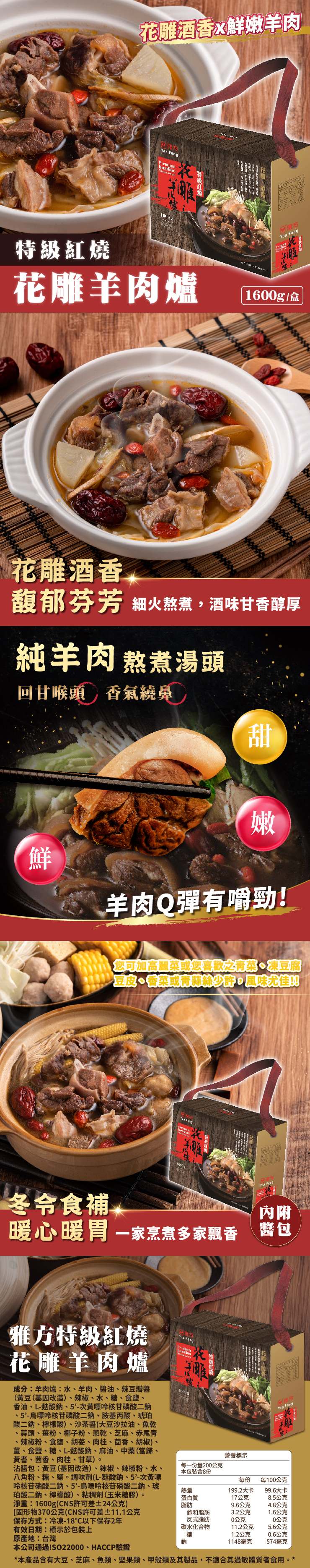 羊肉爐:水、羊肉、醬油、辣豆瓣醬(黃豆(基因改造)、辣椒、水、糖、食鹽、香油、L-麩酸鈉、5-次黃嘌呤核苷磷酸二鈉、5'-鳥嘌呤核苷磷酸二鈉、胺基丙酸、琥珀酸二鈉、檸檬酸)、沙茶醬(大豆沙拉油、魚乾、蒜頭、薑粉、椰子粉、蔥乾、芝麻、赤尾青、辣椒粉、食鹽、胡荽、肉桂、茴香、胡椒)、薑、食鹽、糖、L-麩酸鈉、麻油、中藥(當歸、黃耆、茴香、肉桂、甘草)。